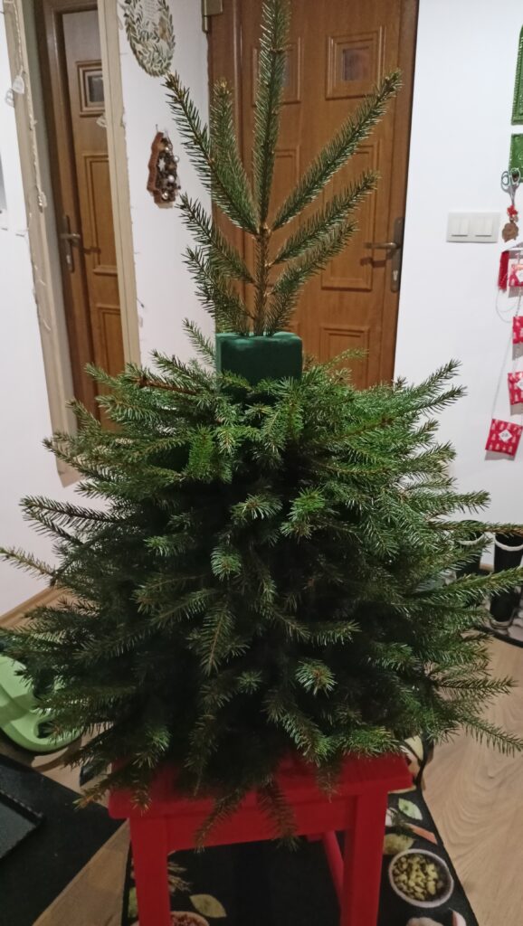 - Fenyőágak (a méretük és mennyiségük rajtad múlik, attól függően, hogy milyen sűrű és nagy fát szeretnél)